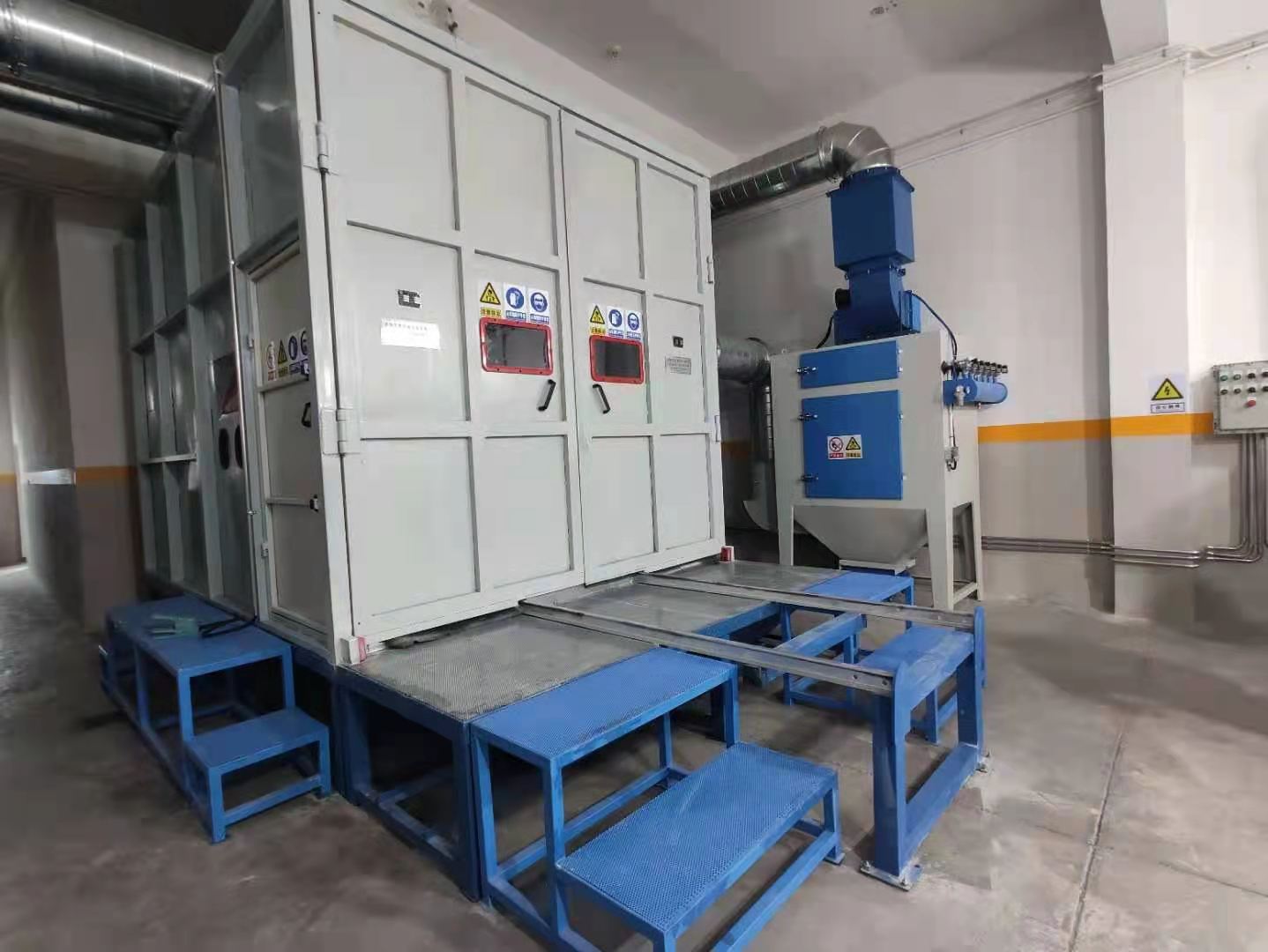 6.喷砂室体采用了上部进风,下部和侧部均可进行吸风的抑尘循环方式。粉尘始终向下引流,室内能见度高,员工操作环境好,同时保护了工人健康;